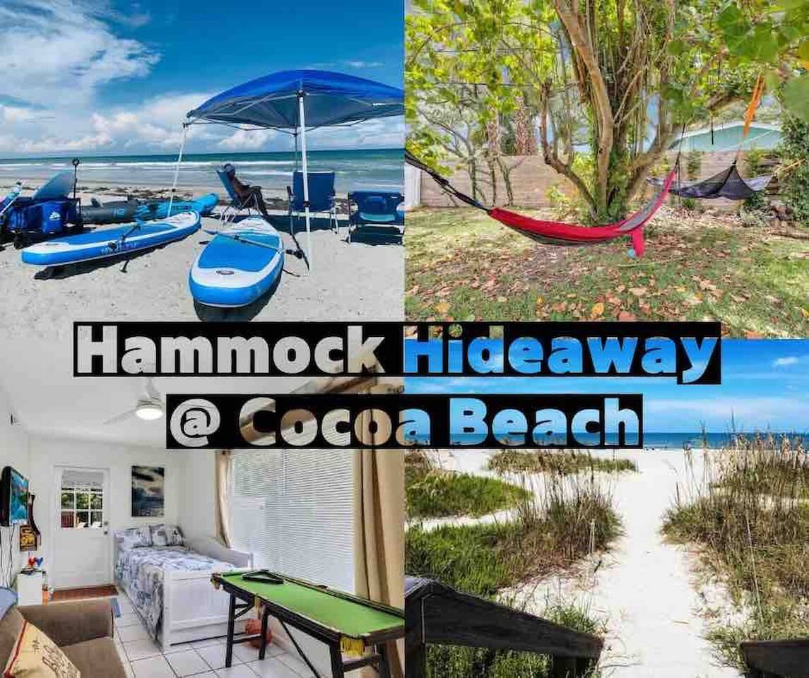 We provide free beach supplies, bikes, kayaks, and six surfboards! ACCESS TO A HEATED POOL AND GAME ROOM. Free game play, bathrooms, and showers. Five-minute walk to an uncrowded, spacious beach—two blocks to take the kayaks out on the Banana River canal. Relax on the screened-in enclosed deck or jump in the hot tub! Enjoy games, a fire pit, and hammocks. The kitchen includes a coffee/tea bar and a waffle maker. The comfortable beds and relaxing living room make this the perfect getaway.