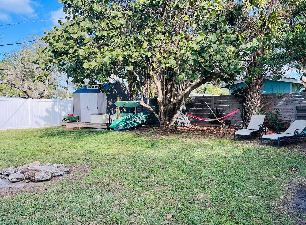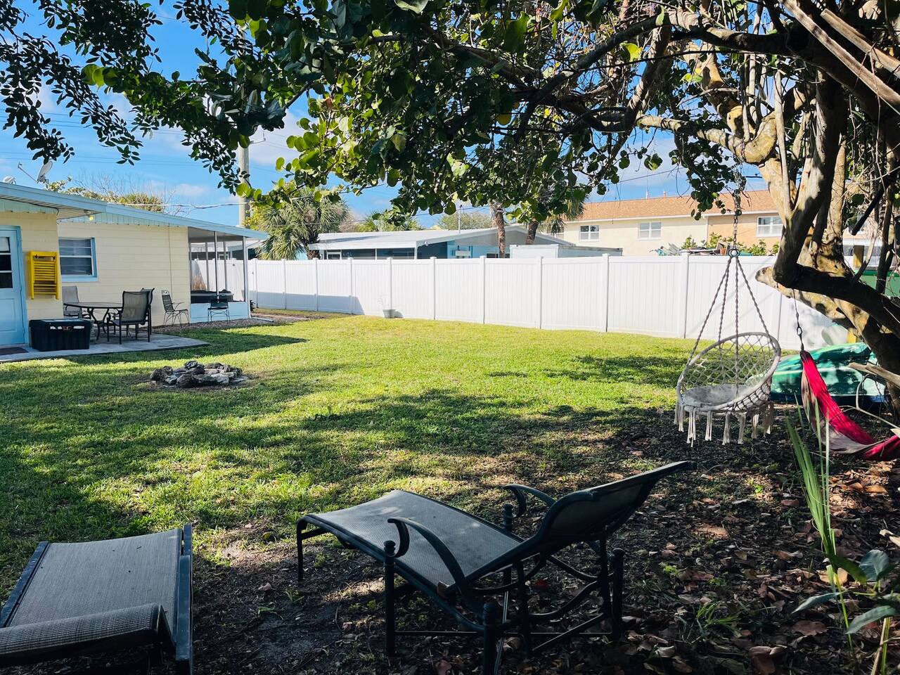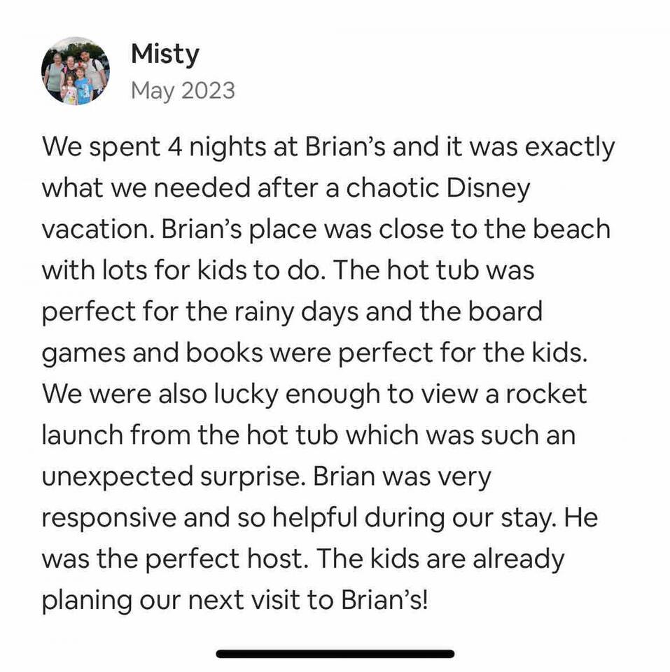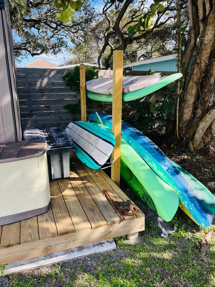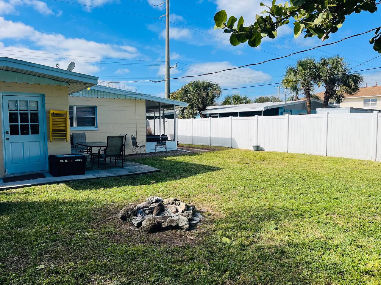 Just a short two-block walk to the beach! Enjoy games, a fire pit, and hammocks. We provide free beach supplies, bikes, kayaks, and six surfboards! The remodeled bathroom includes a coffee/tea bar and a waffle maker. The comfortable beds and relaxing living room make this the perfect getaway.<br><br>Our family loves staying here, and here’s why: comfortable beds, reclining leather sofas, a screened-in porch with a hot tub, cruiser bikes, fishing, a large fenced-in backyard for dogs with beach dog hours, and no high-rises on the beach—just large dunes and homes.<br><br>Each part of the home has its own charm. The living room features a large Roku-enabled Tv, a comfy couch, and a table for six. The master bedroom has a King bed, a Roku 55" Tv, books, and Usb plug-ins for devices, plus a massage chair for relaxation. The second bedroom offers a queen bed and Roku Tv. The third bedroom has a trundle bed with two twin beds and a pull-out couch. The kids will love the small pool table, games, and the Ms. PacMan and Galaga arcade!<br><br>Outside, everything you need for the beach is right by the door. The front screened-in porch has a hot tub and sitting area.<br><br>In the backyard, you can play games, relax in the hammock, eat at the large table, and enjoy the fire pit. You’ll find two hammocks, a complimentary ocean kayak, a two-person kayak, two inflatable kayaks, two paddleboards, foam surfboards, and beach supplies. Each kayak has a simple transport system to carry them two blocks to the ocean or Indian River. You can also enjoy the arcade, hot tub, small pool table, shared grill, and fishing rods.<br><br>This is a duplex with its own entrance and private outdoor area. We bought this property to enjoy walks around the area. The Banana River is two blocks away, perfect for fishing from the dock. The beach is also two blocks away, with friendly neighborhoods in between—great for walking and taking in the beauty of the area.<br><br>You have several ways to get around: drive your own car and use the designated parking space, or take the trolley from Space Coast Area Transit, just one block away. Check the schedule and pricing online. Stellar Transport provides non-emergency medical and handicap transportation in Brevard County for appointments, events, and airport trips. For trips to Cocoa Beach Pier or downtown, you can take a taxi or use Uber/Lyft. For bike rentals, visit A1a Beach Rentals for beach cruisers, hybrid/road bikes, and electric bikes, along with a bike route map.<br><br>Feel free to ask about getting around. This duplex has no shared spaces. A large privacy fence surrounds your area, with games, a fire pit, hammock, and more for your enjoyment.