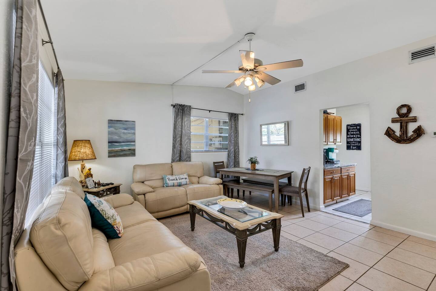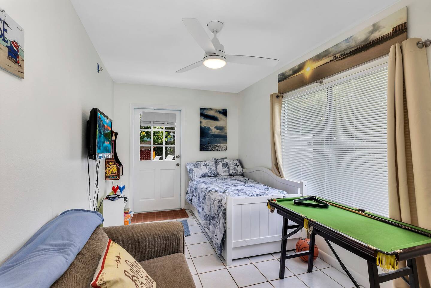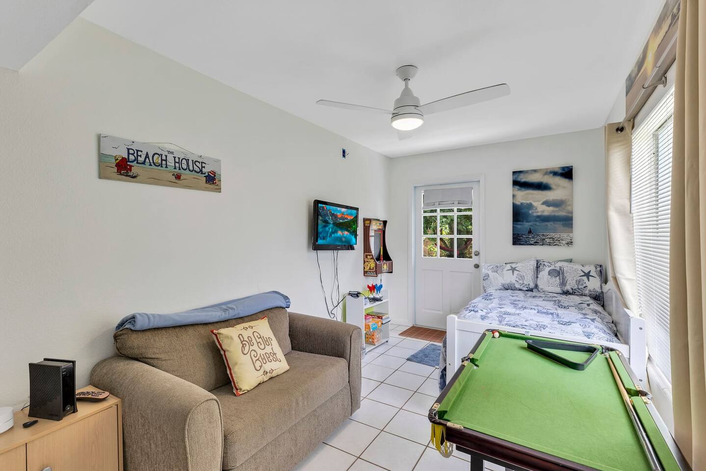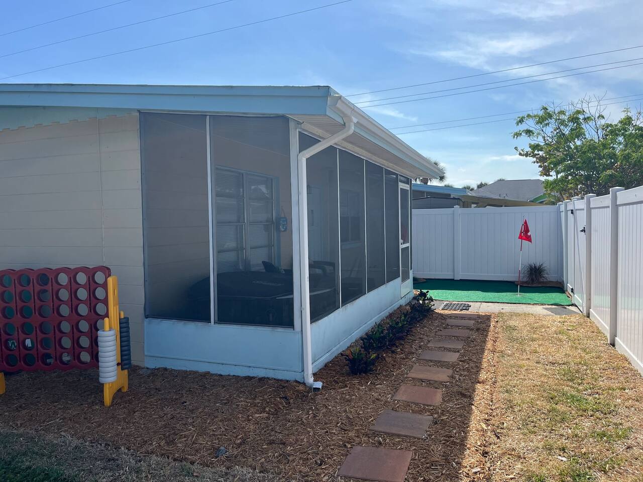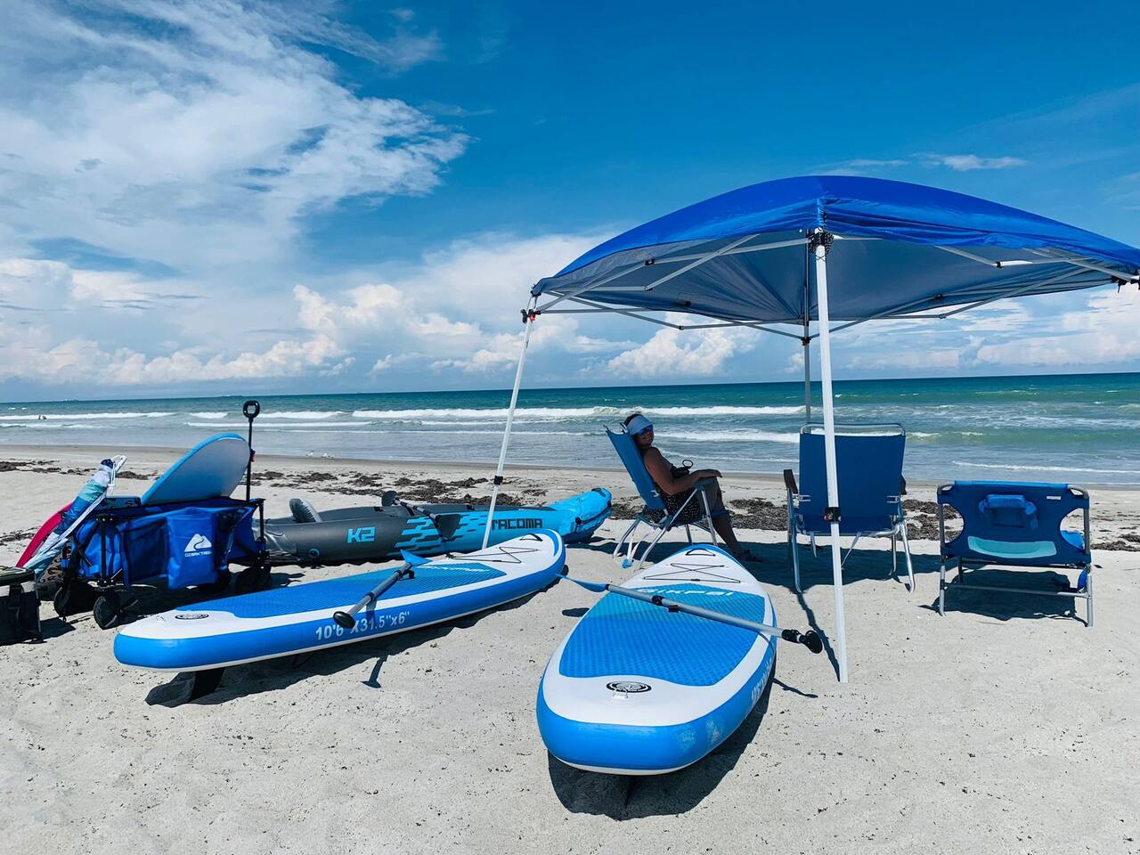 Just a short two-block walk to the beach! Enjoy games, a fire pit, and hammocks. We provide free beach supplies, bikes, kayaks, and six surfboards! The remodeled bathroom includes a coffee/tea bar and a waffle maker. The comfortable beds and relaxing living room make this the perfect getaway.<br><br>Our family loves staying here, and here’s why: comfortable beds, reclining leather sofas, a screened-in porch with a hot tub, cruiser bikes, fishing, a large fenced-in backyard for dogs with beach dog hours, and no high-rises on the beach—just large dunes and homes.<br><br>Each part of the home has its own charm. The living room features a large Roku-enabled Tv, a comfy couch, and a table for six. The master bedroom has a King bed, a Roku 55" Tv, books, and Usb plug-ins for devices, plus a massage chair for relaxation. The second bedroom offers a queen bed and Roku Tv. The third bedroom has a trundle bed with two twin beds and a pull-out couch. The kids will love the small pool table, games, and the Ms. PacMan and Galaga arcade!<br><br>Outside, everything you need for the beach is right by the door. The front screened-in porch has a hot tub and sitting area.<br><br>In the backyard, you can play games, relax in the hammock, eat at the large table, and enjoy the fire pit. You’ll find two hammocks, a complimentary ocean kayak, a two-person kayak, two inflatable kayaks, two paddleboards, foam surfboards, and beach supplies. Each kayak has a simple transport system to carry them two blocks to the ocean or Indian River. You can also enjoy the arcade, hot tub, small pool table, shared grill, and fishing rods.<br><br>This is a duplex with its own entrance and private outdoor area. We bought this property to enjoy walks around the area. The Banana River is two blocks away, perfect for fishing from the dock. The beach is also two blocks away, with friendly neighborhoods in between—great for walking and taking in the beauty of the area.<br><br>You have several ways to get around: drive your own car and use the designated parking space, or take the trolley from Space Coast Area Transit, just one block away. Check the schedule and pricing online. Stellar Transport provides non-emergency medical and handicap transportation in Brevard County for appointments, events, and airport trips. For trips to Cocoa Beach Pier or downtown, you can take a taxi or use Uber/Lyft. For bike rentals, visit A1a Beach Rentals for beach cruisers, hybrid/road bikes, and electric bikes, along with a bike route map.<br><br>Feel free to ask about getting around. This duplex has no shared spaces. A large privacy fence surrounds your area, with games, a fire pit, hammock, and more for your enjoyment.