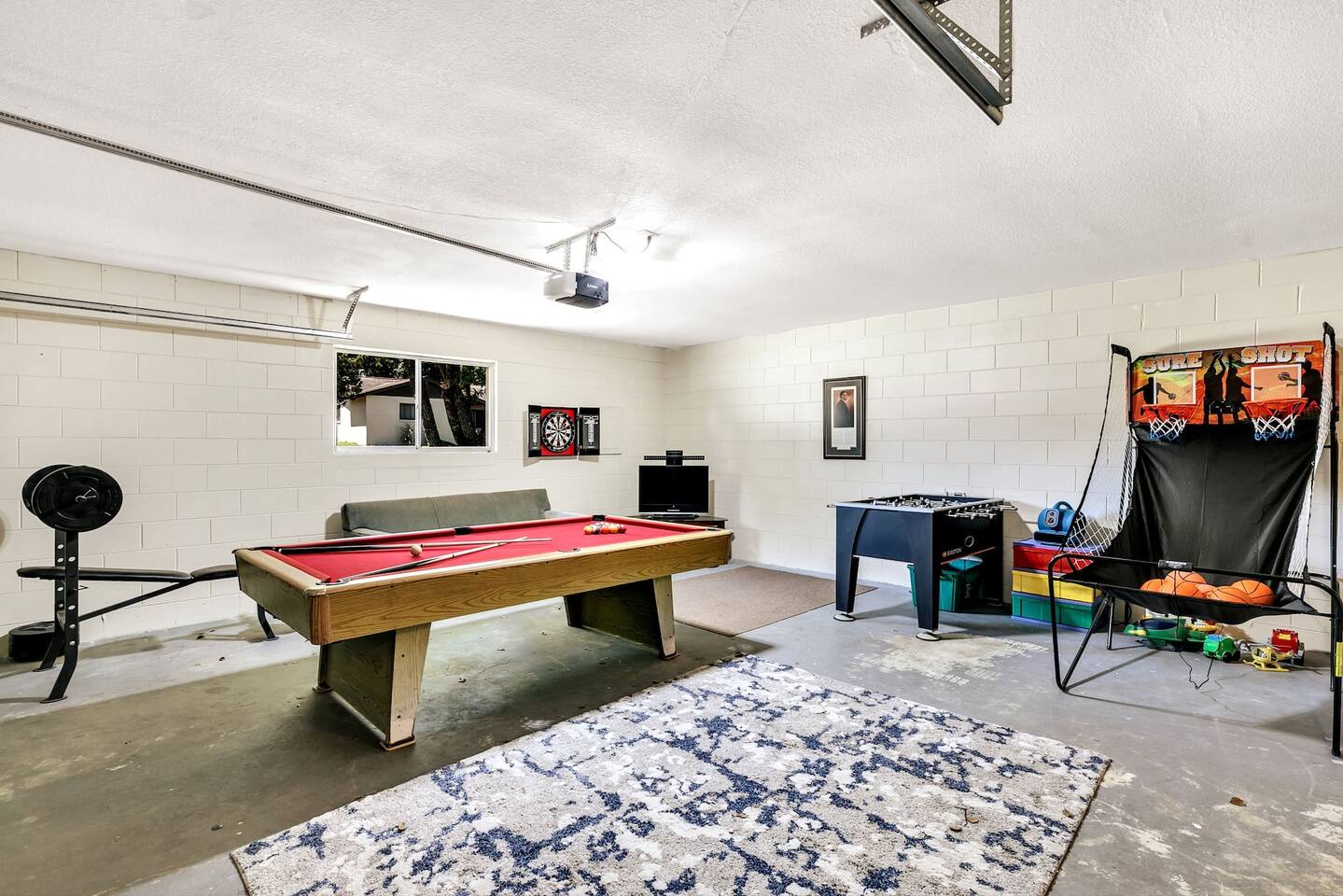 Unwind in a comfortable and well-equipped home! Play pool, fusball, darts, and basketball in the game garage. Conveniently located near Orlando/Sanford Airport, Wekiwa Springs, and a variety of attractions. Enjoy the fully equipped kitchen for all your culinary needs, sleep soundly in comfortable beds, and relax on the spacious back deck with a privacy fence. We have an old school Nintendo 64 and retro Galaga game on the wall to play. Perfect for work, family, or vacation getaway!